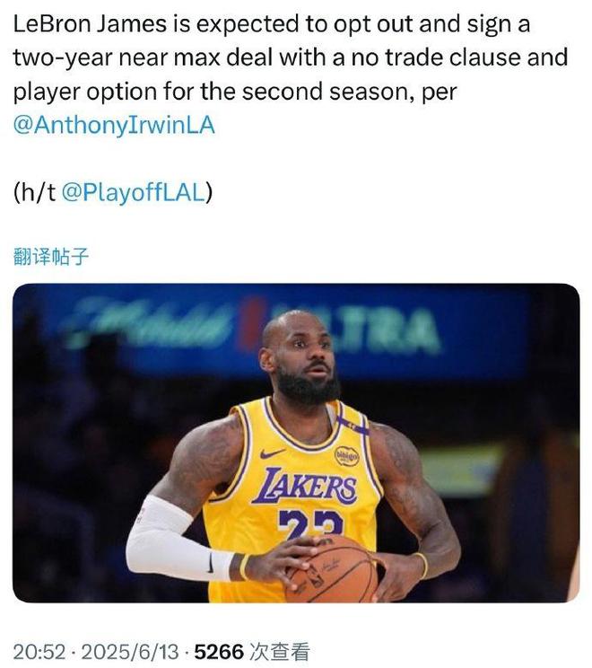 北京时间6月14日,40岁的詹姆斯今夏会做何种抉择?根据美媒ClutchPoints湖人记者Anthony Irwin报道,詹姆斯预计将跳出球员选项,并与湖人再签一份接近顶薪的1+1两年合同,其中包括交易否决权,且第二年依然是球员选项。